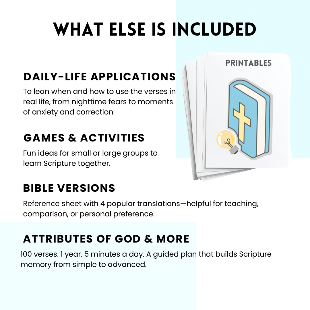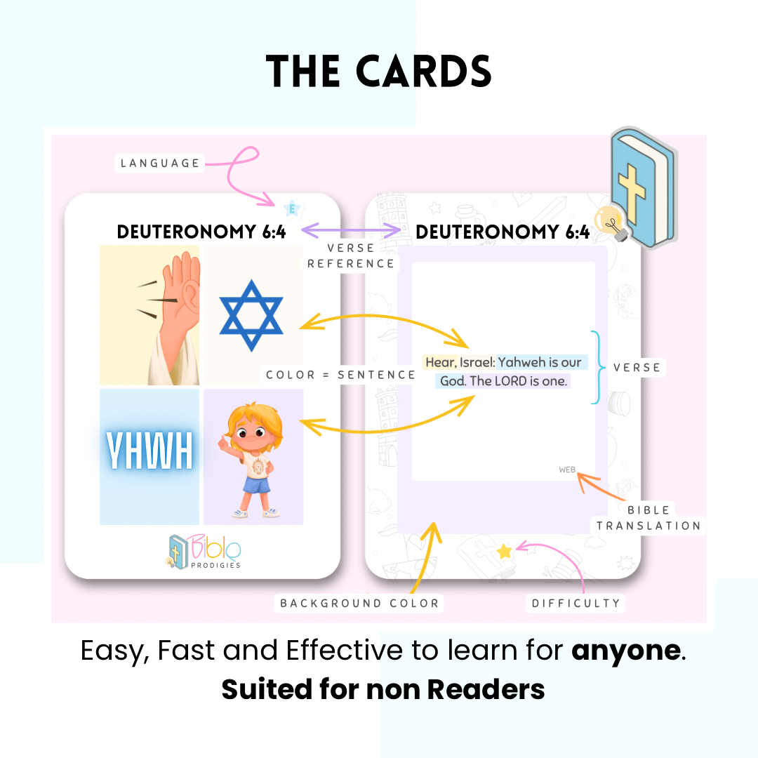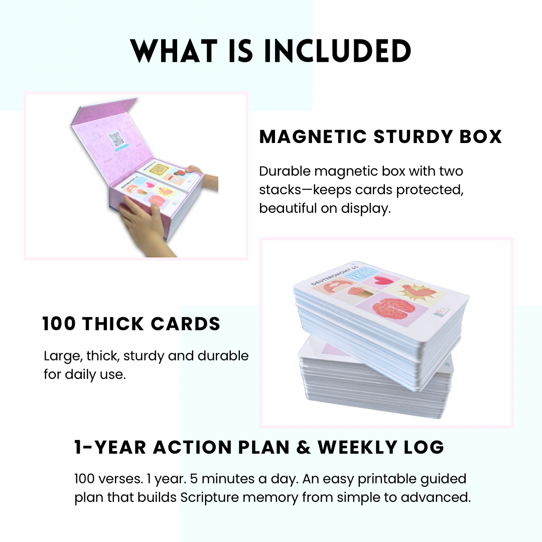 Neuroscience shows the brain processes images much faster than words, and studies show we remember significantly more when words are paired with meaningful images. Each verse is paired with visual cues to help instantly connect the words in your brain to the images on the card, speeding up learning and increasing retention. Just 5 minutes a day helps you and your kids learn & memorize Scripture for life.